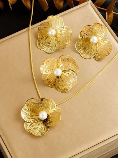 Shine with nature’s elegance through Glowfye’s gold floral pearl jewelry set, featuring a delicate flower design with pearl centers. This matching necklace and earring set makes the perfect gift for weddings, festive occasions, or sophisticated evening looks.