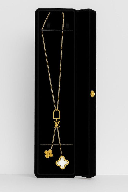Glowfye’s gold pendant necklace features a sleek chain with two delicate charms – a golden flower and a white clover motif – symbolizing luck and beauty. Perfect for layering or wearing solo, this piece adds timeless sophistication to any outfit.